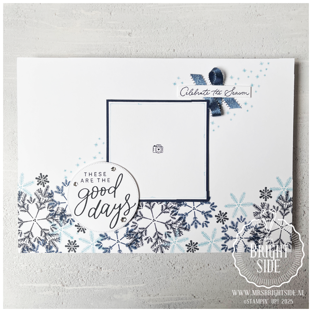 De andere tekst komt uit de Delicate Pines Stempelset en eronder heb ik een stuk van het Misty Moonlight Lint met zilveren details geplakt. Rondom heb ik kleine sterretjes gestempeld met Balmy Blue Classic Stampin’ Inkt. Een aantal Facetsneeuwvlokken maken het af.