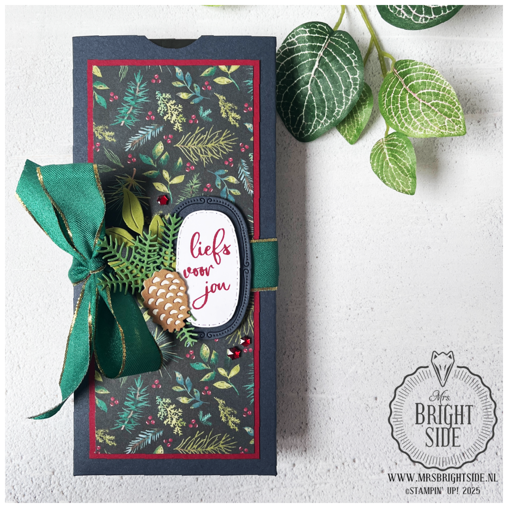 Rondom het midden van de verpakking heb ik het Shaded Spruce lint met gouden rand gestrikt. Daarachter schoof ik een paar gestanste dennentakjes in Garden Green en Old Olive Cardstock, samen met een dennenappel in Pecan Pie en Basic Beige Cardstock – allen gestanst met de Delicate Pines Dies.