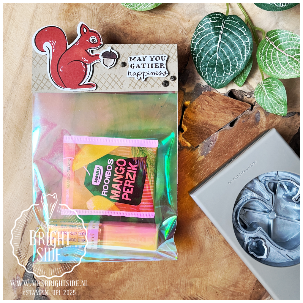 De topper bestaat uit een stuk Crumb Cake Cardstock, waarop ik een subtiel achtergrondje stempelde. Daar bovenop pronkt een schattige eekhoorn met een klein eikeltje en een tekstlabel met de woorden “May you gather happiness”. Een klein detail met veel effect!