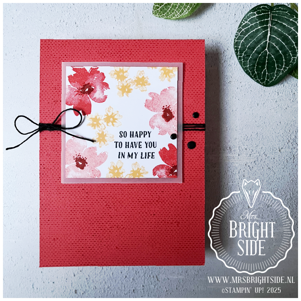 Ik koos voor een Calypso Coral basiskaart (10,5 x 29 cm), een kleur die ik niet vaak gebruik, dus leuk om ‘m vandaag in de spotlight te zetten. De voorzijde heb ik dus ton-sur-ton bestempeld met de Lasting Linen Stempel en Calypso Coral Classic Stampin’ Inkt. Vervolgens heb ik er zwart Bakkerstouw omheen gestrikt, wat een stoer effect geeft.