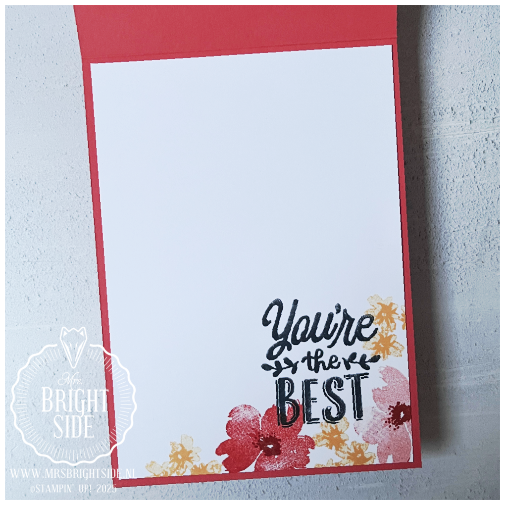 Ook de binnenzijde van de kaart heb ik vormgegeven. Nog meer gestempelde bloemen met de Petals of Beauty Stempelset en ook weer een toffe tekst uit de Creative Haven Stempelset.