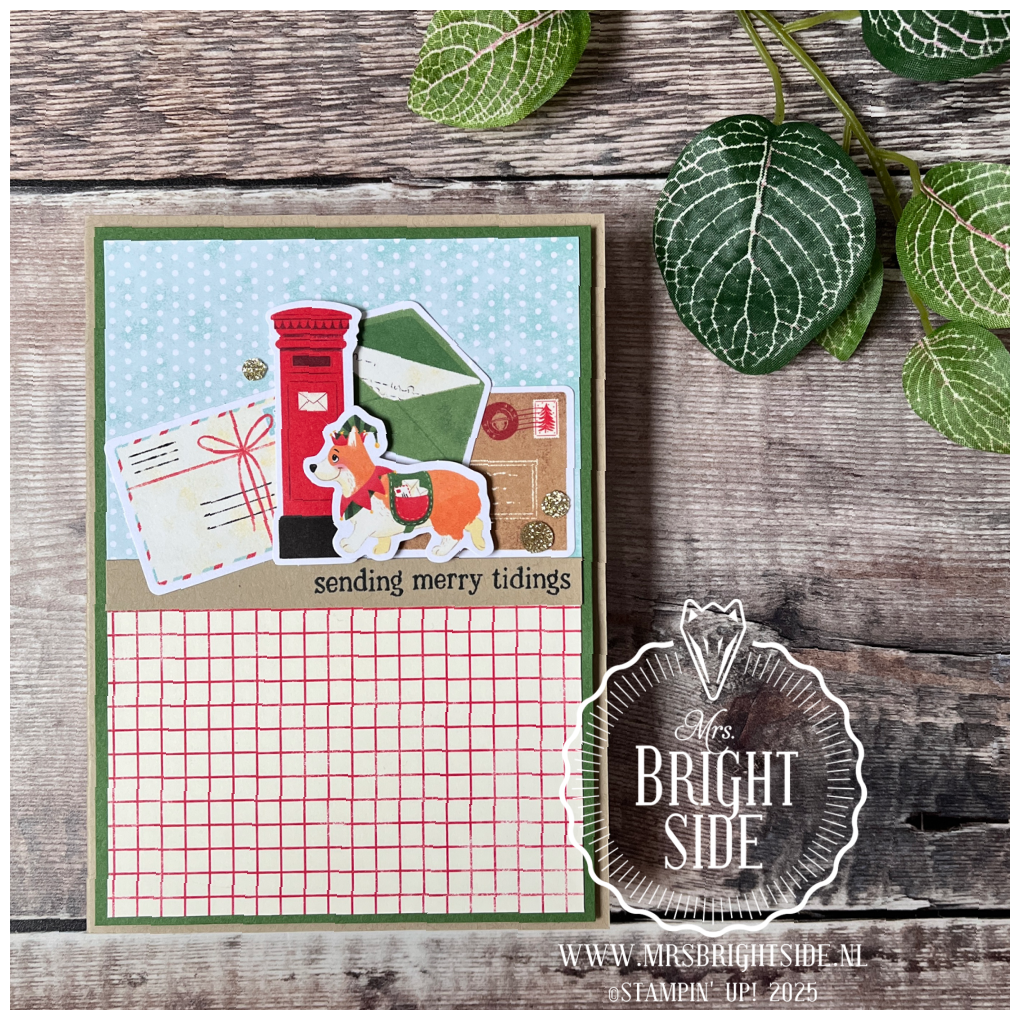 Het hart van de kaart is een speels tafereeltje opgebouwd met de voorgestanste motieven uit het North Pole Delivery DSP: een klassieke rode brievenbus, vrolijke kerstpost en natuurlijk een superschattige corgi die de kerstboodschappen bezorgt. De tekst “sending merry tidings” komt uit de Jolly Delivery stempelset, waardoor alles mooi bij elkaar past.