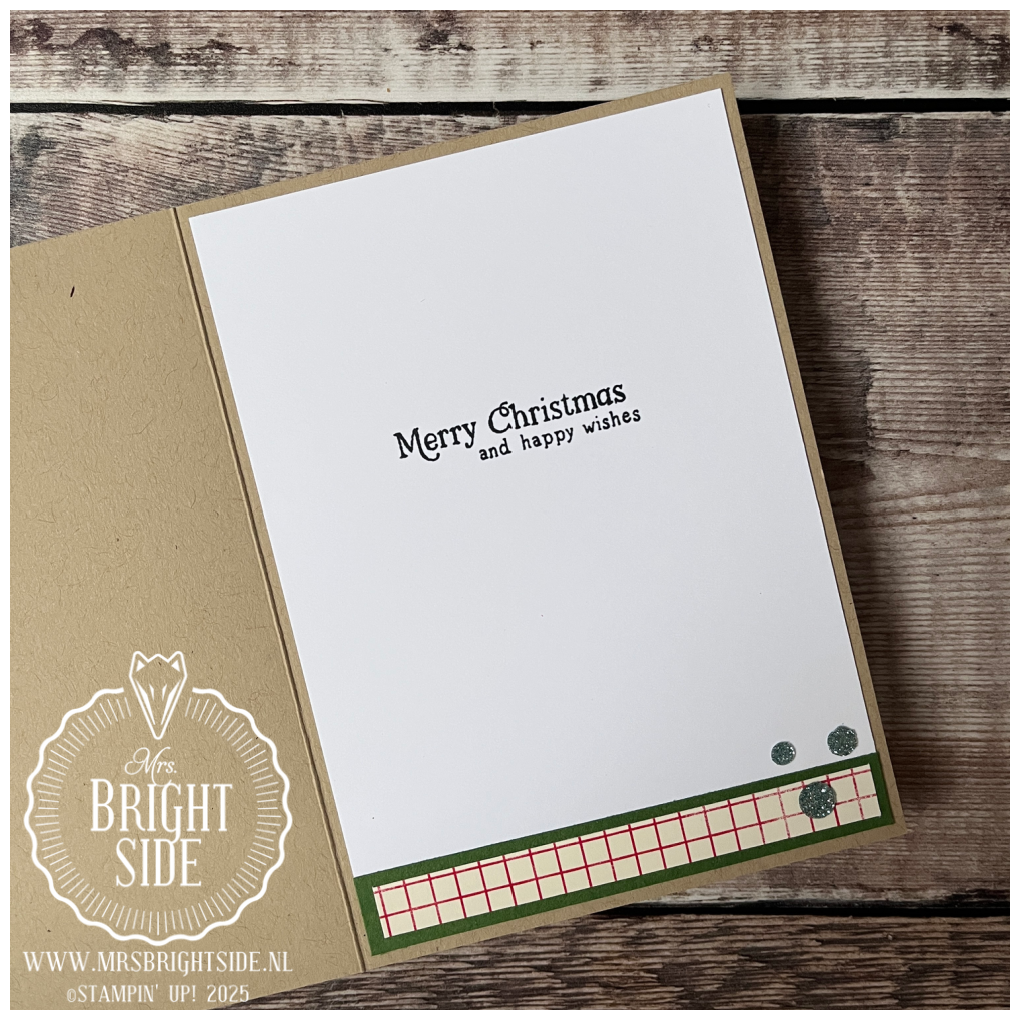 Ook de binnenkant kreeg een feestelijk accent met een stukje DSP, wat gestempelde elementen en een mooie kerstgroet. Zo wordt het openen van de kaart net zo leuk als de buitenkant!