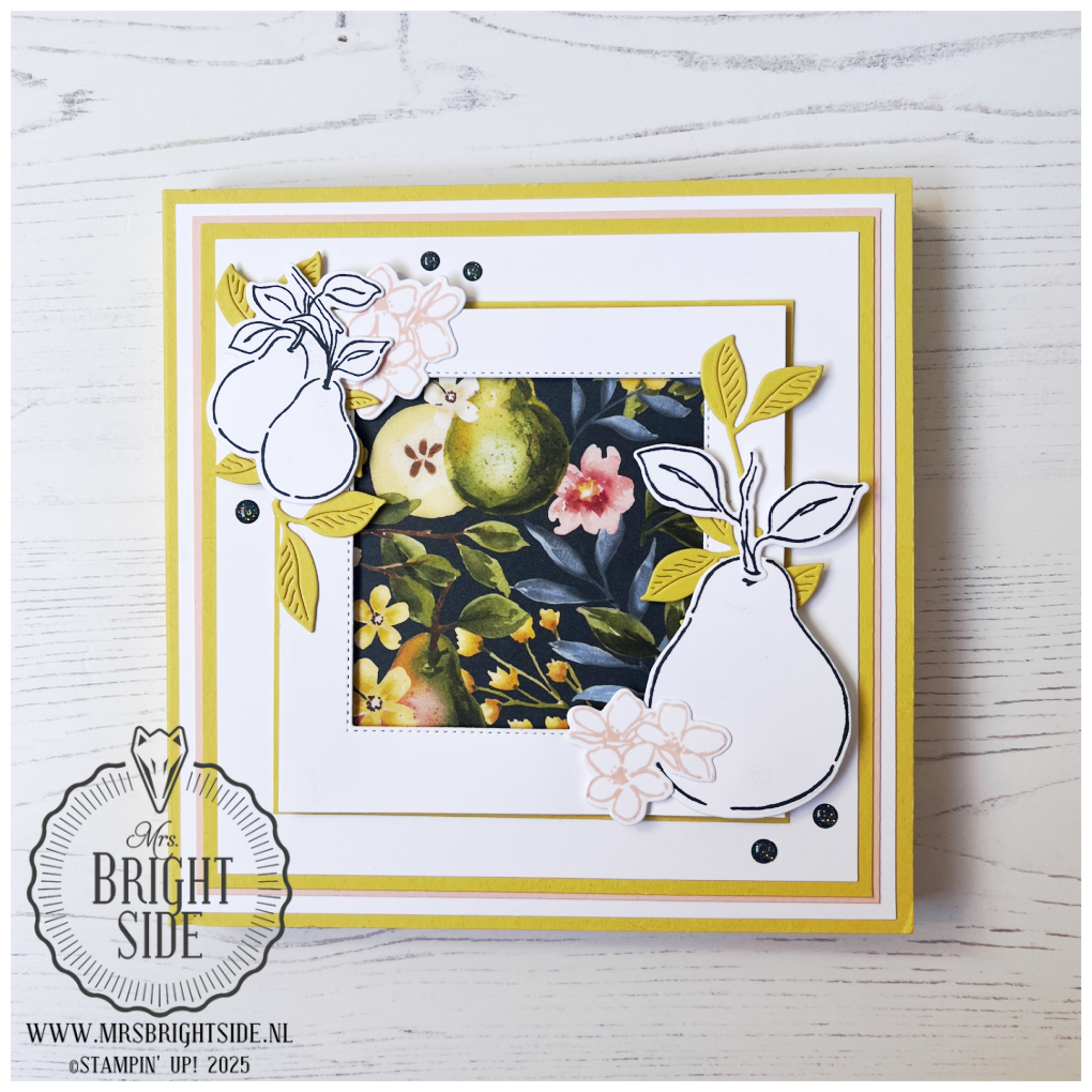 Zoals Stampin’ Up! het zelf omschrijft: “Je beleeft de haast peer-fecte creatieve ervaring als je aan de slag gaat met het Painterly Pears-collectiepakket. Deze collectie biedt een smaakvolle combinatie van perenpatronen, tere bloesems, weelderig fruit en sierlijke blaadjes in een zacht kleurenpalet met vintage uitstraling.”