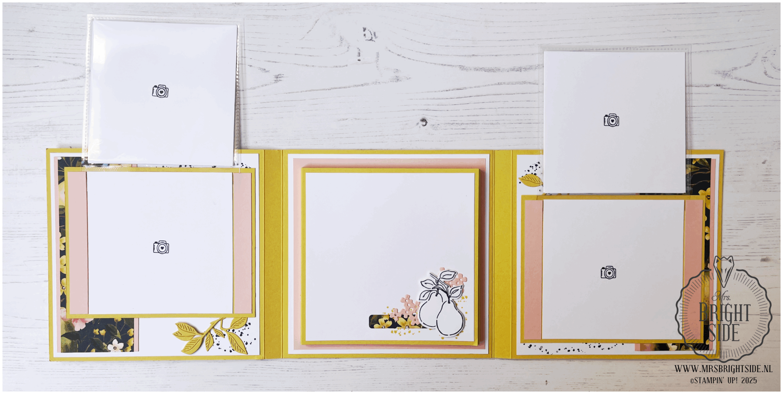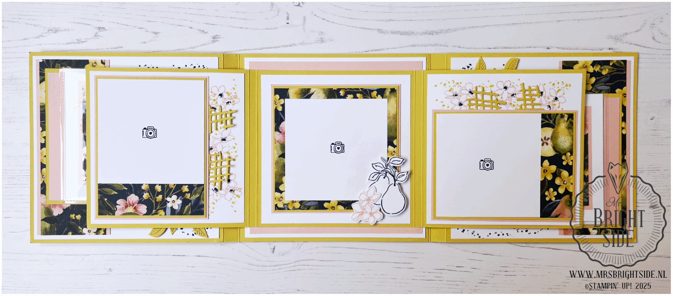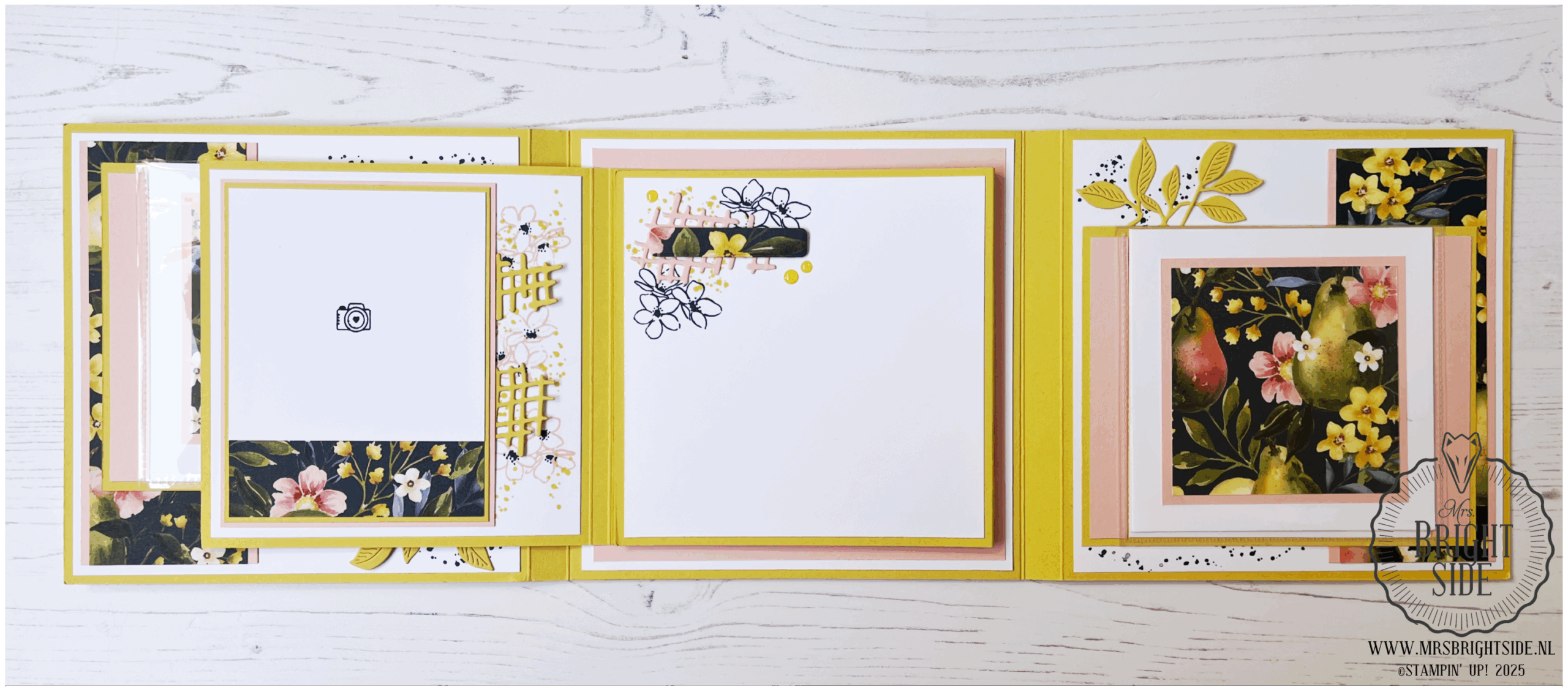 De basis van het album is gemaakt van Darling Duckling Cardstock, aangevuld met Petal Pink en Basic White Cardstock. Het prachtige Painterly Pears Designpapier speelt de hoofdrol op de voorzijde en binnenpagina’s.
