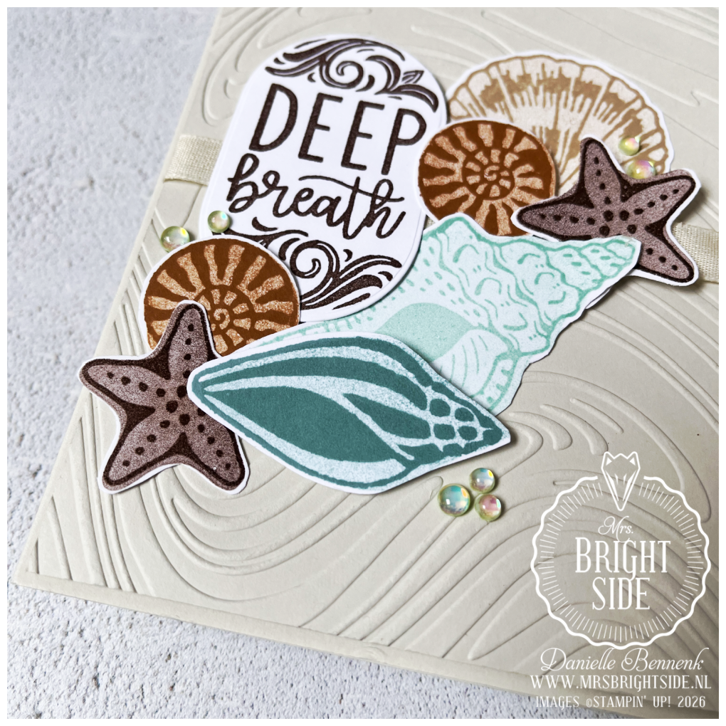 Zowel de basiskaart als de mat zijn gemaakt van Basic Beige cardstock. De mat heb ik geëmbost met de Soft Waves 3D embossing folder, wat meteen zorgt voor een subtiele beweging in het ontwerp. Op dit paneel heb ik verschillende schelpen toegevoegd in warme bruintinten zoals Early Espresso, Crumb Cake en Pecan Pie. Deze heb ik gecombineerd met Pool Party en Lost Lagoon, zodat het geheel een frisse, maritieme sfeer krijgt. De tekst is eveneens gestempeld in Early Espresso, zodat alles mooi in balans blijft.