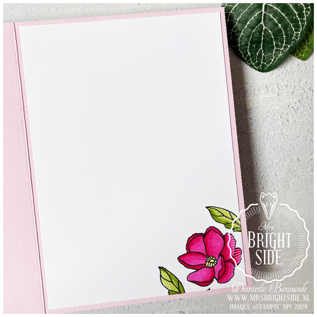 Ook de binnenkant van de kaart heb ik meegenomen in het ontwerp, met een kleine bloem in de hoek. Zo voelt de kaart als één geheel en is hij helemaal af zodra je hem opent.