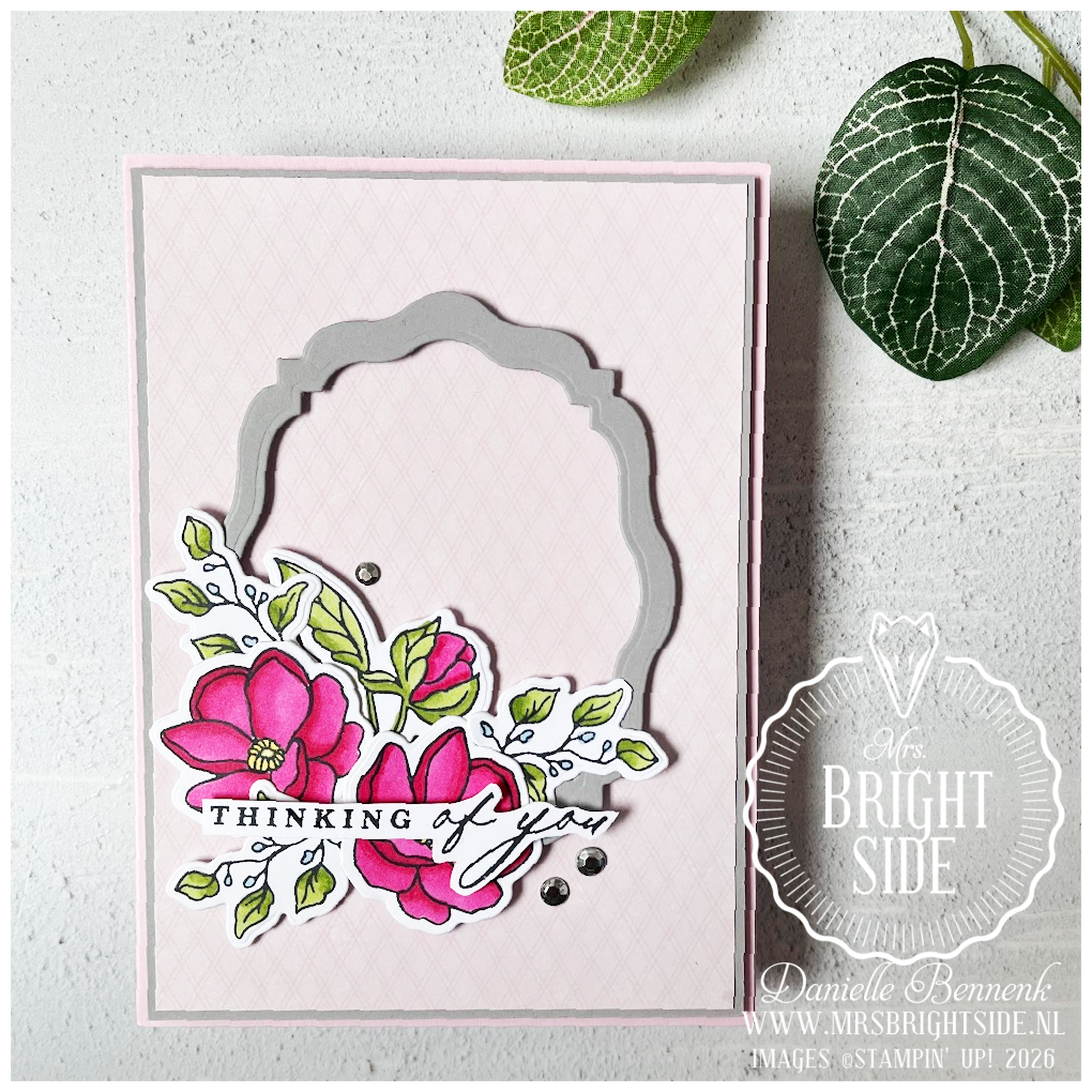 Voor deze kaart heb ik bewust gekozen voor een zachte, romantische kleurencombinatie. De basiskaart is gemaakt van Bubble Bath cardstock, met een mat van Smoky Slate cardstock. Daarbovenop heb ik een laag Mixed Up Patterns designpapier gebruikt, ook een nieuw product uit de mini catalogus. Met de Beautifully Celebrated stansen heb ik een frame gestanst uit Smoky Slate cardstock, dat als rustige omlijsting fungeert voor het bloemwerk.