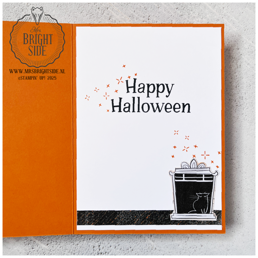 De tekst “Don’t worry, eat sweets” is gestempeld met Tuxedo Black Memento Inkt op Pumpkin Pie Cardstock, vervolgens los geknipt en met Mini Stampin’ Dimensionals opgeplakt. Ook het venster kreeg wat extra diepte met dimensionals. Drie zwarte glittersterren zorgen voor een subtiele finishing touch.
