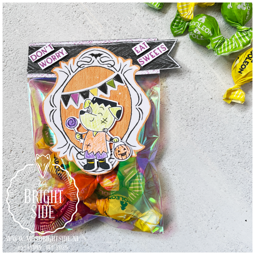 Een vrolijke zoete traktatie waarbij ik het Spooky Sweet Speciaal Designpapier van Stampin’ Up! combineerde met de fleurige snoepzakjes met regenboogglans én het Spooky Halloween Productpakket.