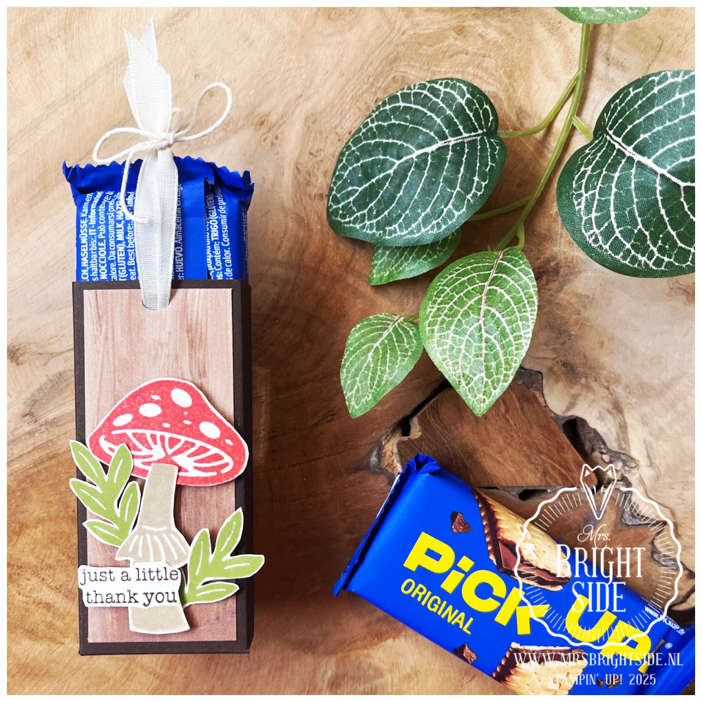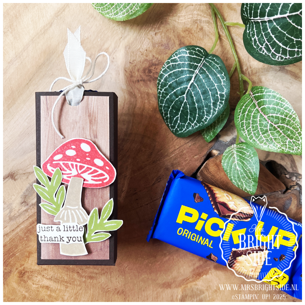 Vandaag laat ik je het derde en laatste spotlight project van deze week zien met de Terrific Toadstools stempelset. Dit keer heb ik geen kaart gemaakt, maar een kleine verpakking – perfect als aardigheidje of bedankje. In dit doosje past precies een Pick-Up koekje: twee krokante biscuitjes met daartussen een laag chocolade. En het leukste? Het is een zogenaamde trekverpakking!
