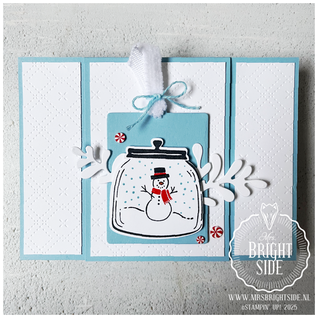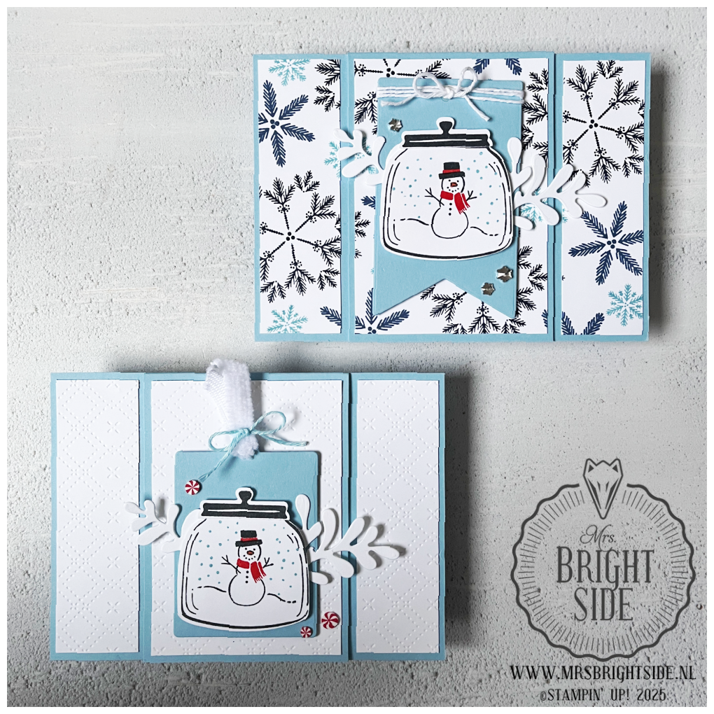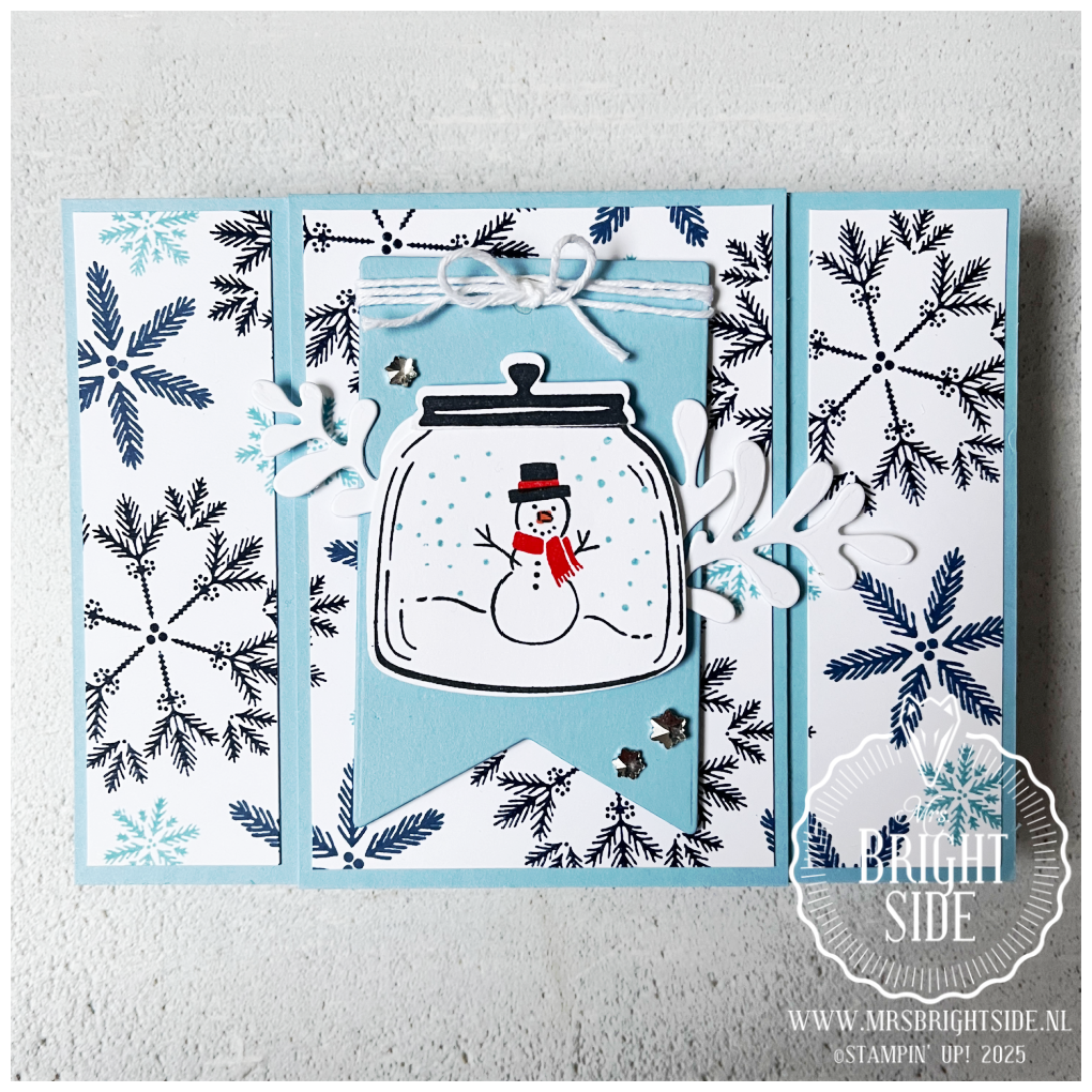 Deze maand staat het thema Winter centraal en ik ging aan de slag met twee winterse flap kaarten vol sneeuwvlokken, ijsblauw en een schattig winters tafereel m.b.v. de Jar of Joy Stempelset.