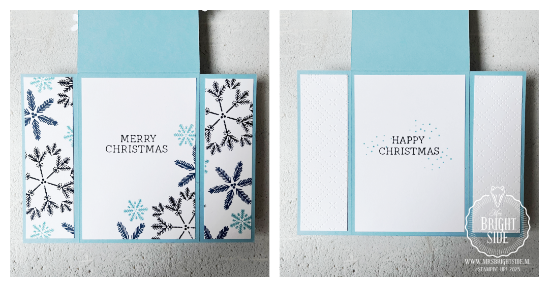 Een Balmy Blue flapkaart met gestempelde of geëmboste panelen, versierd met een label, takjes en een winters potje. Door de flap omhoog te openen komt de mooie binnenkant tevoorschijn met de gestempelde kerstwens.